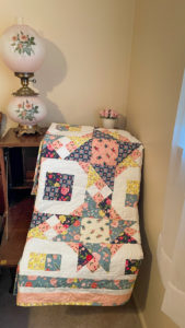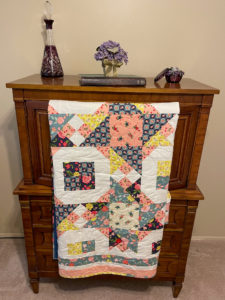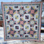 Pre-machine binding being sewn on, here's a peak at the fun Bee's Crossstich fabric I selected to use to back the quilt. Also, a close up of the fun quilting, which almost looks like kites.